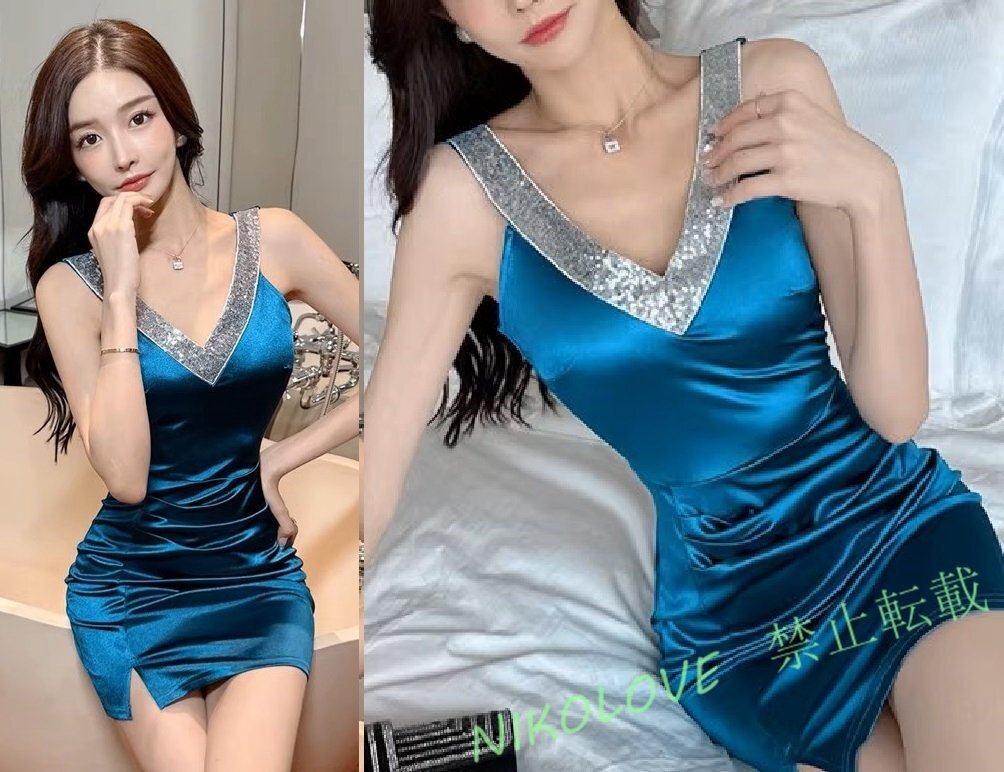 > ☆新品*セクシー**良質*とろみ素材*Vネック*シルバー*ライン*仕様*スリット*入*タイト*ワンピース*メタリック*LF644