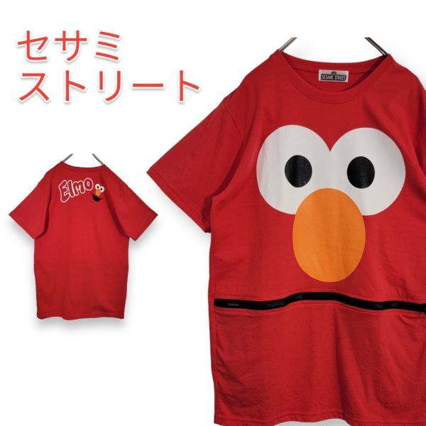 > SESAME STREET セサミストリート エルモ プリント チャック 半袖 Tシャツ 赤 ELMO キャラ Lサイズ相当