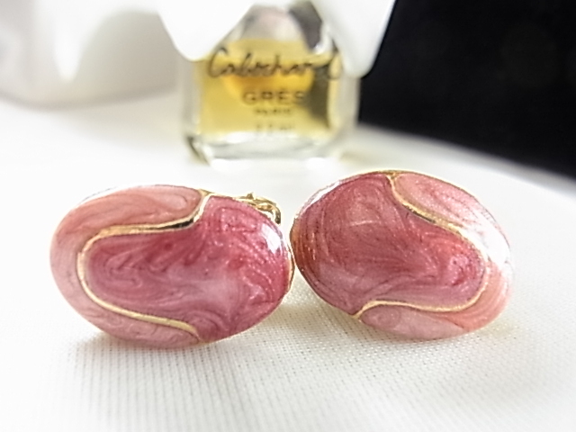 > ビンテージ/ヴィンテージ ぼたんいろピンクとローズピンクトーンとゴールドトーンのマーブル調 楕円形が素敵 華やぐイヤリング■