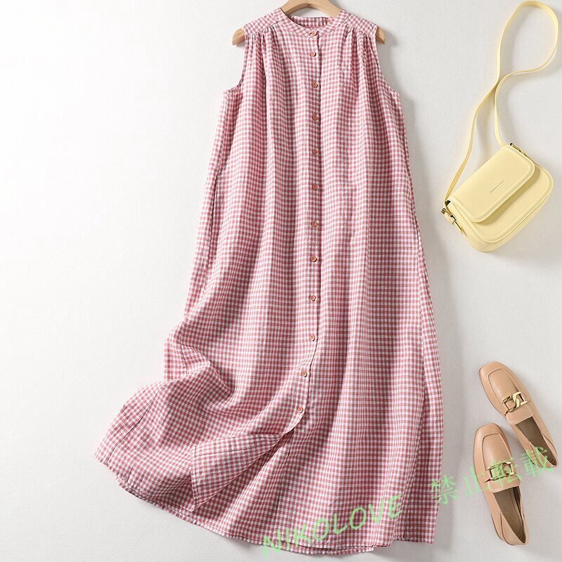 - 新品春夏カジュアル ノースリーブワンピース ロングワンピース チェック柄 綿麻混紡 リネン ワンピース 大きいサイズ おしゃれ 2XL LH820
