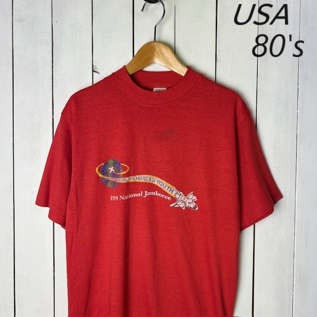 > T●364 USA古着 80s USA製 National Jamboree Tシャツ L S程度 赤 オールド ヴィンテージ アメリカ ボーイスカウト BSA シングルステッチ