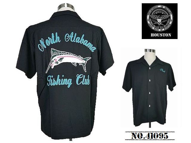 > 【送料無料 30%OFF】HOUSTON ヒューストン 刺繍ボウリングシャツ (ボーリングシャツ) 「FISHING CLUB」柄 NO.41095 BLACK_Lサイズ