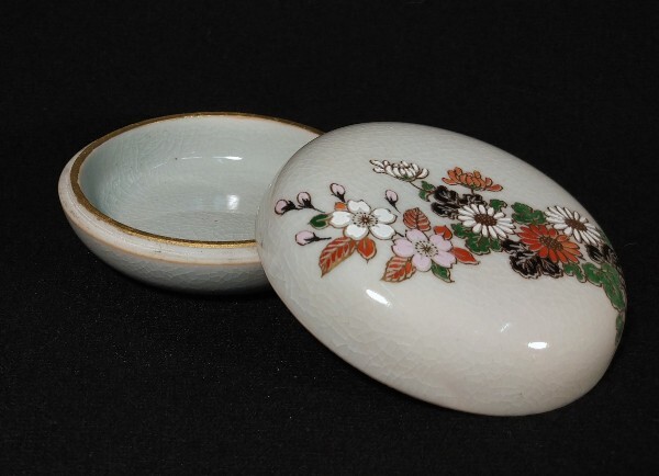 - 九谷焼 暁堂 染付 金彩 色絵 花文 9cm 香合 香道具 b-74f3720
