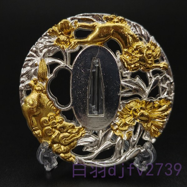 > SY113 日本刀装具 刀鍔 牡丹獅子図 合金製 現代品 つば ツバ 刀剣美術 重さ約117G 厚さ約6mm