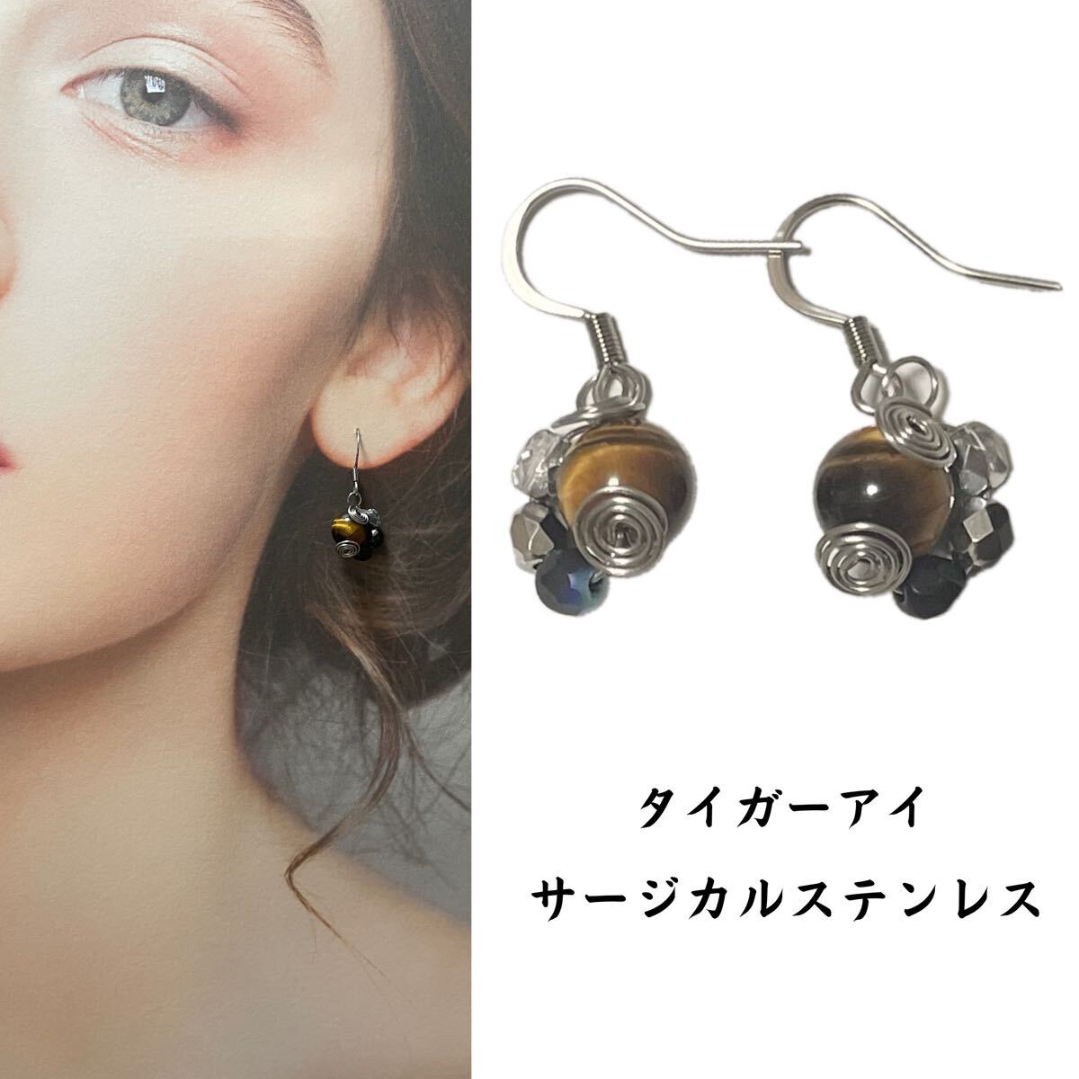 - W107. 天然石 ピアス タイガーアイ ハンドメイド サージカルステンレス アレルギーフリー ニッケルフリー