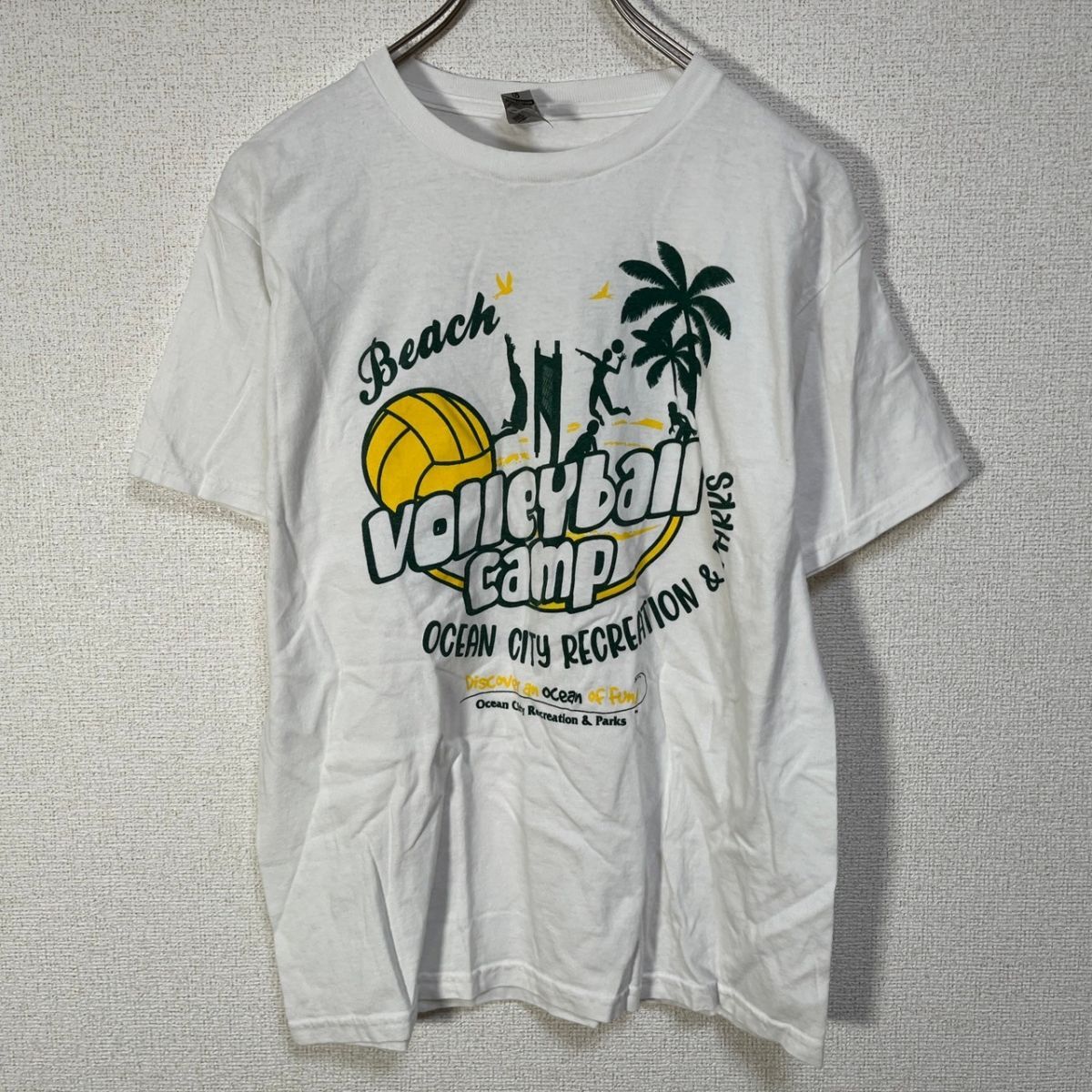 - ギルダン 半袖Tシャツ ビーチバレーボールキャンプ デカロゴ ヤシの木D1 古着 入手困難 激レア希少人気 ビッグロゴ ホワイト企業ロゴ