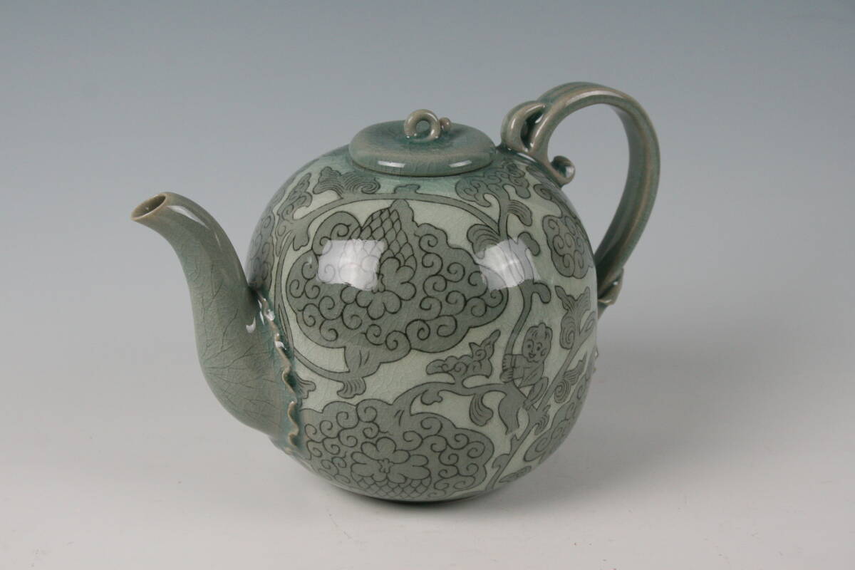- 人間文化財 柳海剛 作 高麗青磁象嵌童子文酒注子