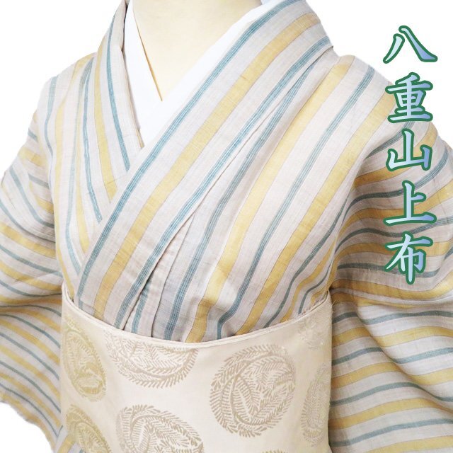 > 特選 夏物 八重山上布 着物 中古 苧麻 カジュアル 縦縞模様 浅黄色 多色 身丈166cm 裄68.5cm L トール きもの北條 A1067-3