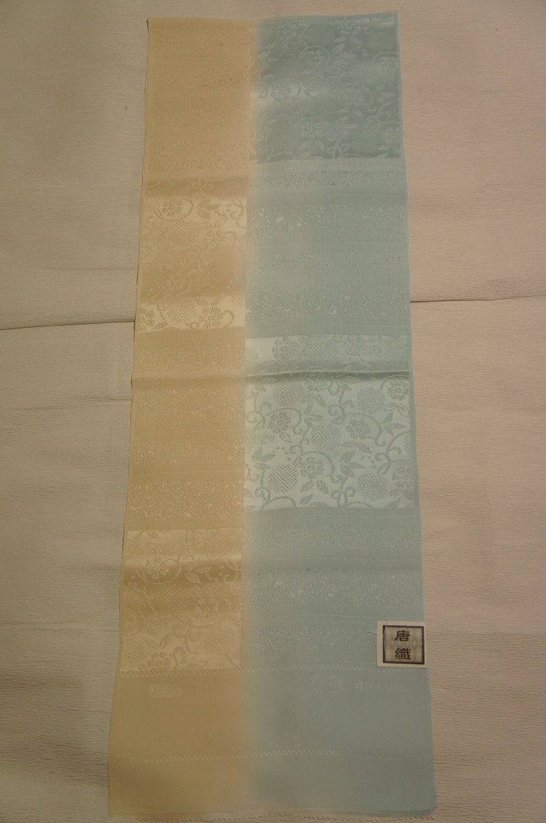 - 特選新品『和装庵』正絹ちりめん薄水色練色縦ぼかし横段花唐草模様帯揚[E15196]