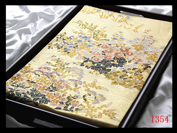 - I354厳選西陣 純金箔 振袖可 秋草紋 金色地 典雅な縫いの表情 六通正絹純金糸高級美術袋帯 ◇検◇簪着物名古屋帯帯締め