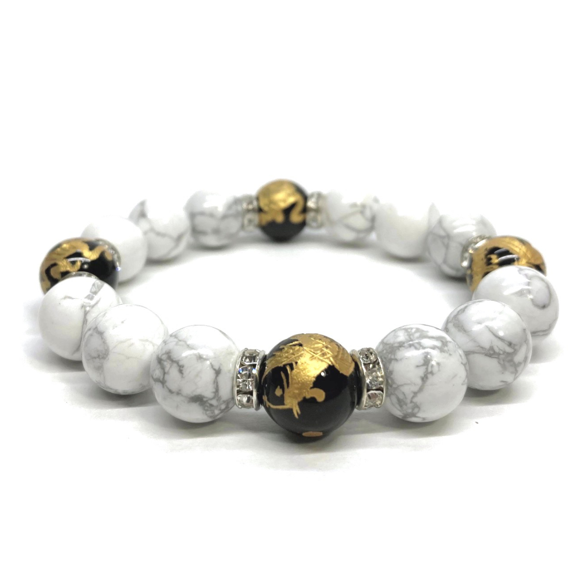 - 四神獣金彫オニキス×ハウライト 12mm パワーストーン ブレスレット天然石 青龍 白虎 玄武 朱雀 運気上昇 開運 金運 お守り 四神相応 S