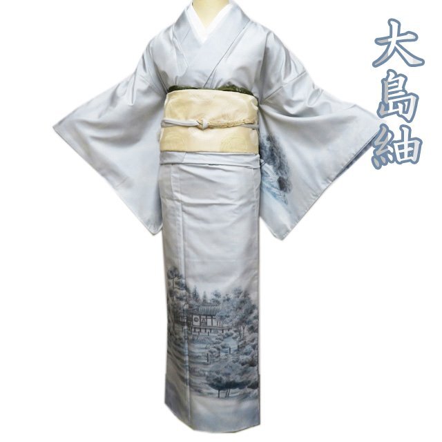 > 大島紬 着物 中古 正絹 袷 セミフォーマル 作家物 落款 風景 秋條寺 白鼠色 青系色 多色 身丈161cm 裄66cm M きもの北條 A1073-1