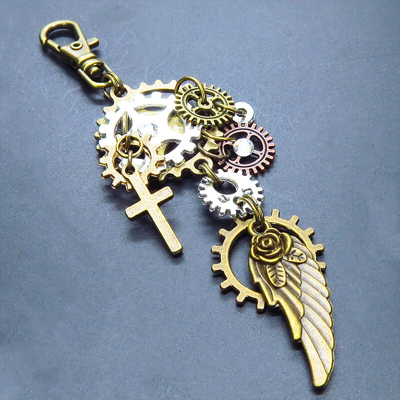 - アンティークゴールド 歯車と翼を組合せたスチームパンク風キーホルダー バッグチャーム 金具変更可