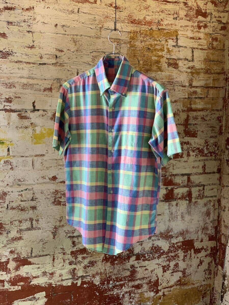 > 60s PLAID B.D.SHIRT ヴィンテージ ビンテージ チェックシャツ ボタンダウンシャツ 半袖シャツ 3点留め アメトラ トラッド 50s 送料無料
