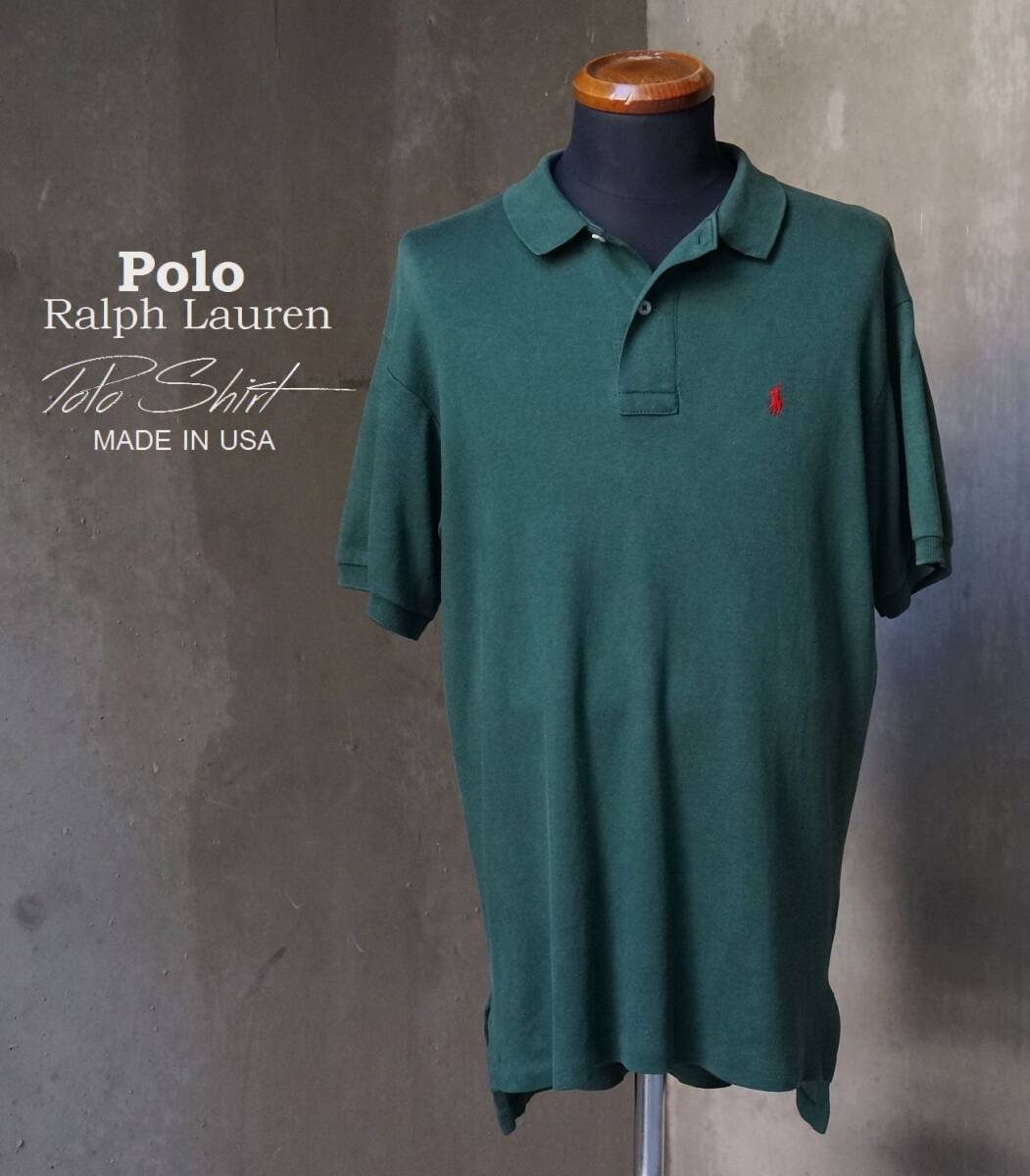 > 90s USA製 ポロ Polo ラルフローレン Ralph Lauren 深緑 ダークグリーン 半袖 ポロシャツ M L相当 polo 92 93