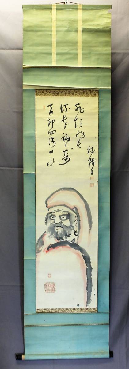 - B-442★ 【摸写】 掛軸 書 達磨 「滲」? 「着撲」? 「霊止宗」? 「杪括子」? 紙本 印刷ではない 軸先木製 中国 蔵出 古玩