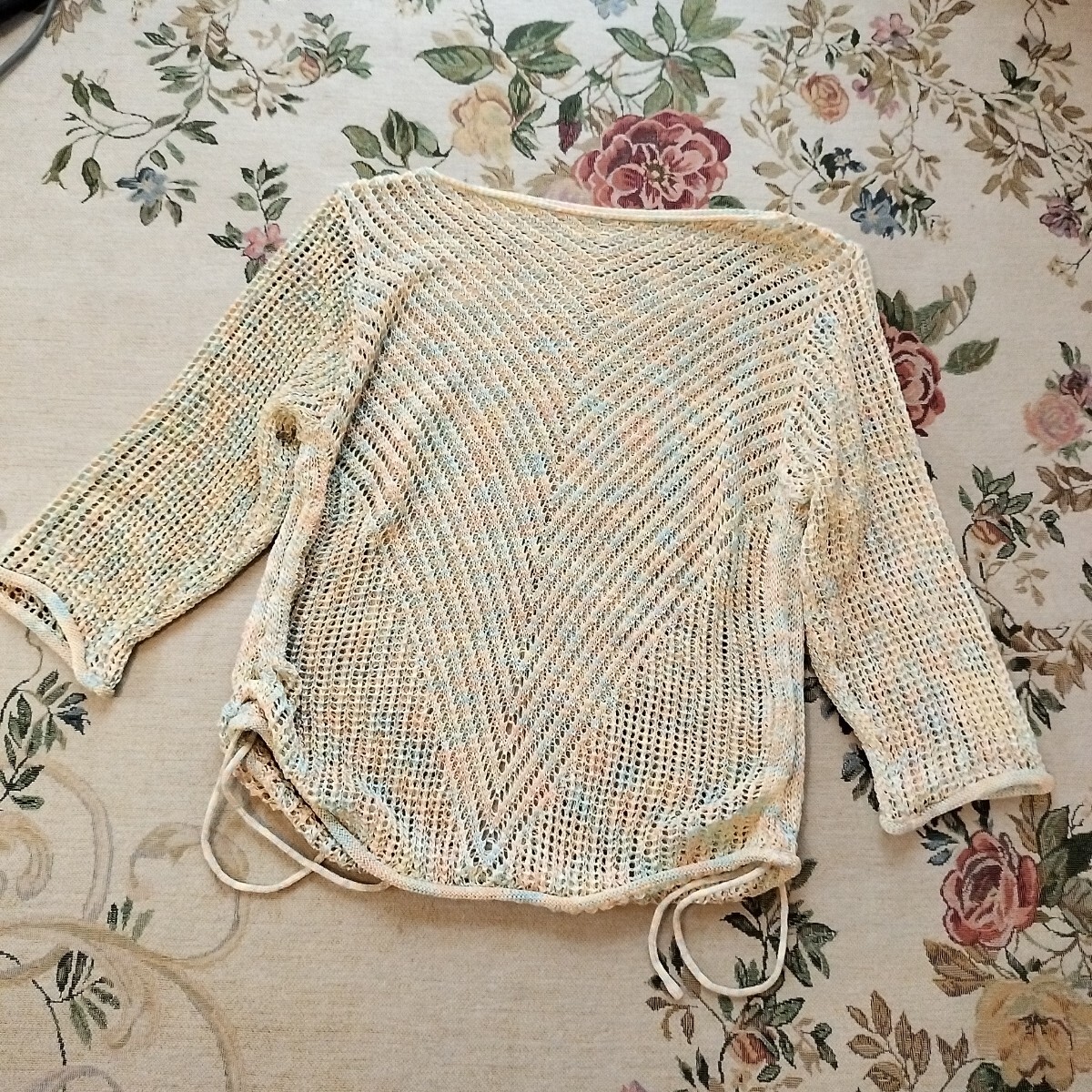 - リボン糸のニットソー 透かし編み混ざり糸ブラウジングボートネック 七分袖長袖