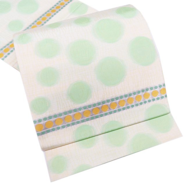 - 袋帯 未使用 正絹 カジュアル 仕立て上がり 六通 西陣 熊井 水玉模様 オフホワイト 薄緑色 淡黄色 きもの北條 A1081-11