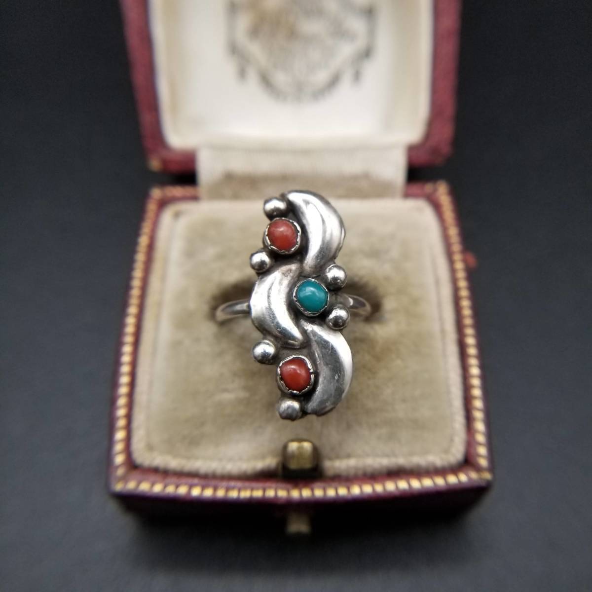 > サウスウェスタンジュエリー ウェーブ コーラル 925 シルバー ヴィンテージ リング 銀 指輪 曲線美 ターコイズカラー装飾 小さめ Y18-V