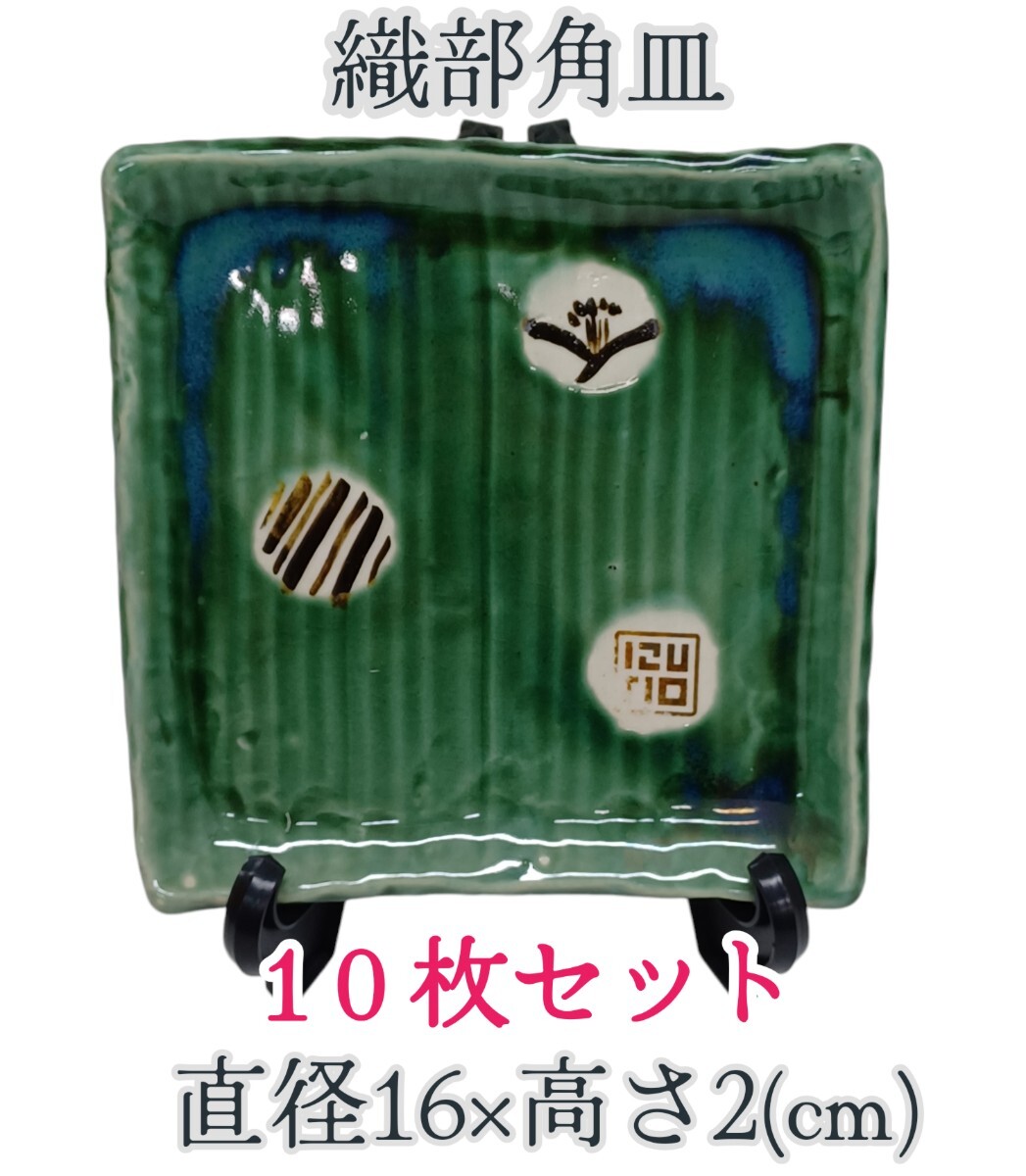 - 岩⑲-2 ) 織部角皿 10枚セット 直径16×高さ2cm 和食器 料亭 旅館 角皿 中皿 陶器 食器 皿 緑 懐石 割烹 定食 飲食店 店舗 業務用 240905
