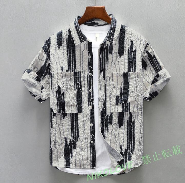 - 新品 花柄シャツ メンス 半袖シャツ ストライブ柄シャツ サマー 薄手 胸ポケット カジュアルシャツ スタイリッシュサイズ選択可 LF863