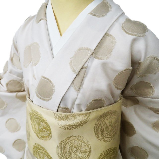 > 播包 新品 播州織 着物 木綿 ポリエステル 単衣 カジュアル 水玉模様 灰白色 ベージュ 身丈170cm 裄68cm L トール きもの北條 A1086-13