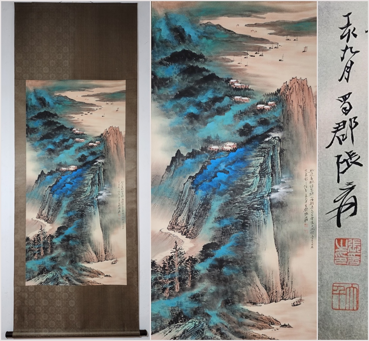- 古美術 掛け軸 中国・近現代 「張大千書」 紙本 【撥彩山水図】 立軸 書道 巻き物 真筆逸品 肉筆保証 唐物 古画 LT-240984