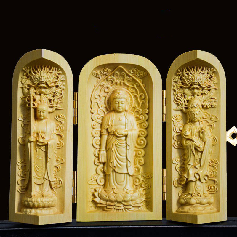 - 【柘植 木彫 仏像】◆娑婆三聖開閉式仏像筒型◆ ナチュラル/天然木製/手作り/ハンドメイド/細工彫刻/インテリア/プレゼント/開運風水厄除け