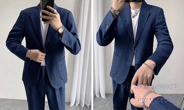 > V549☆新品メンズ スーツ ビジネススーツ スーツセットアップ 麻 夏涼しい テーラードジャケット 上下セット シワ感 ネイビー M~2XL