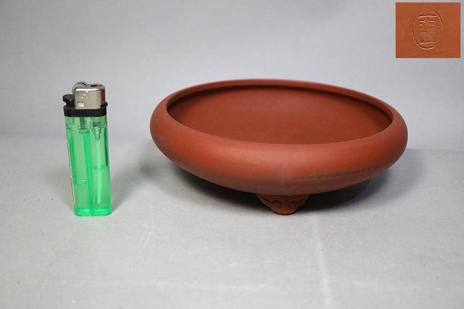 - b60) 小品 盆栽鉢「一陶園」・常滑焼・胴経/約17.6cm 高さ/約5.3cm 三脚付 丸鉢 小鉢 <在銘 朱泥 緑泥 紫泥 烏泥 植木鉢 山野草鉢 蘭鉢
