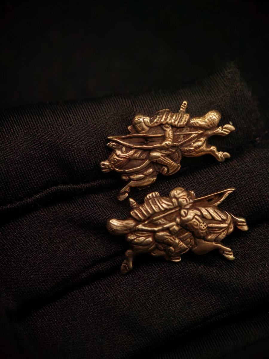 - s-102 宇治川合戦図目貫 容彫 金色絵 日本刀 武具 刀装具 銅製 小道具 鍔 目貫 縁頭 拵 長 3CM