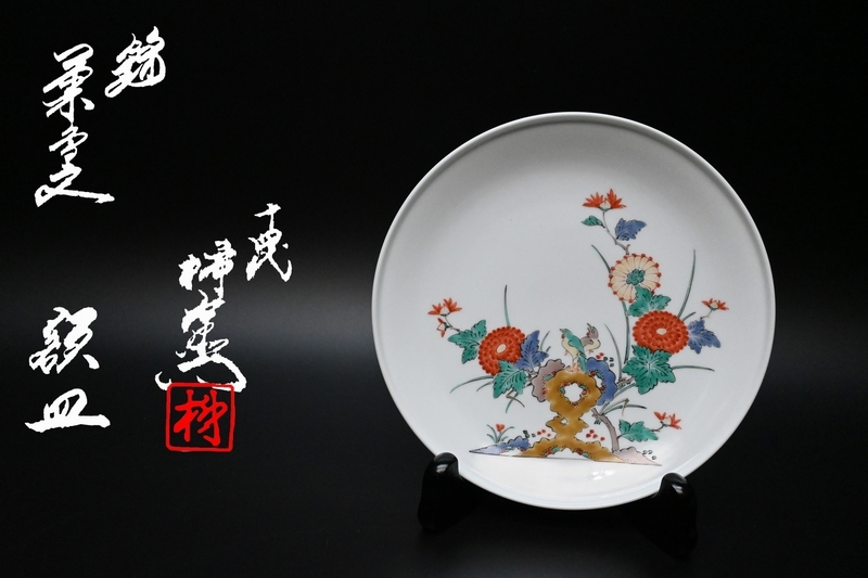 > 人間国宝 十四代 酒井田柿右衛門 額皿 ■ 美しい 錦 菊鳥文 飾り皿[ 径約18.5㎝]■ 心落ち着く 図柄 色絵 共箱入り №10026■