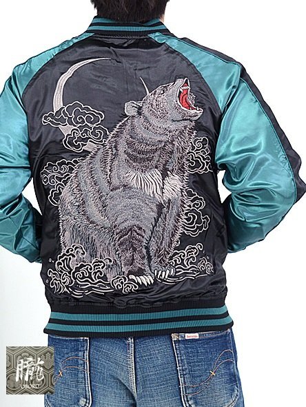 > 熊サテンスカジャン◆朧 ブラック×ブルーグリーンXLサイズ 9043814 和柄 和風 刺繍 クマ スーベニアジャケット おぼろ