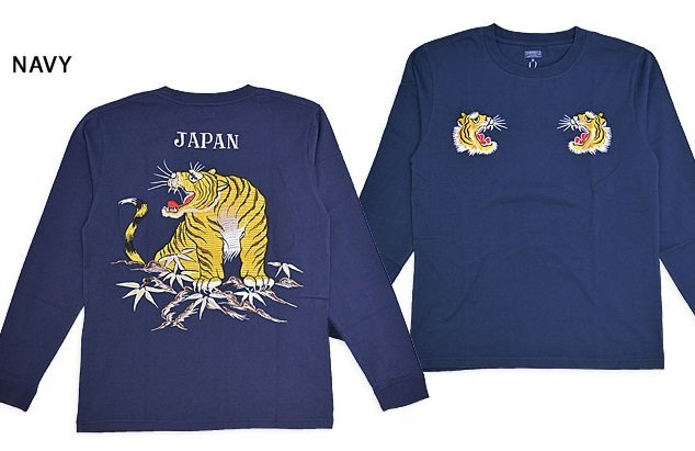 - スカ刺繍ロングTシャツ「TIGER」◆テーラー東洋 ネイビーMサイズ TT69471 和柄 和風 虎 トラ スカジャン風