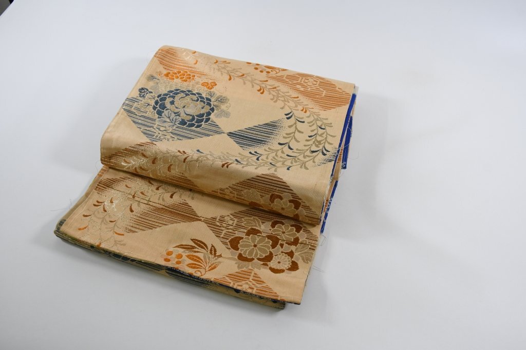 - 袋帯名古屋帯 アンティーク菱文に花 柳三本 千両 牡丹 花 正絹 帯丈366cm ★着物屋 ne-12060 桜庭呉服店