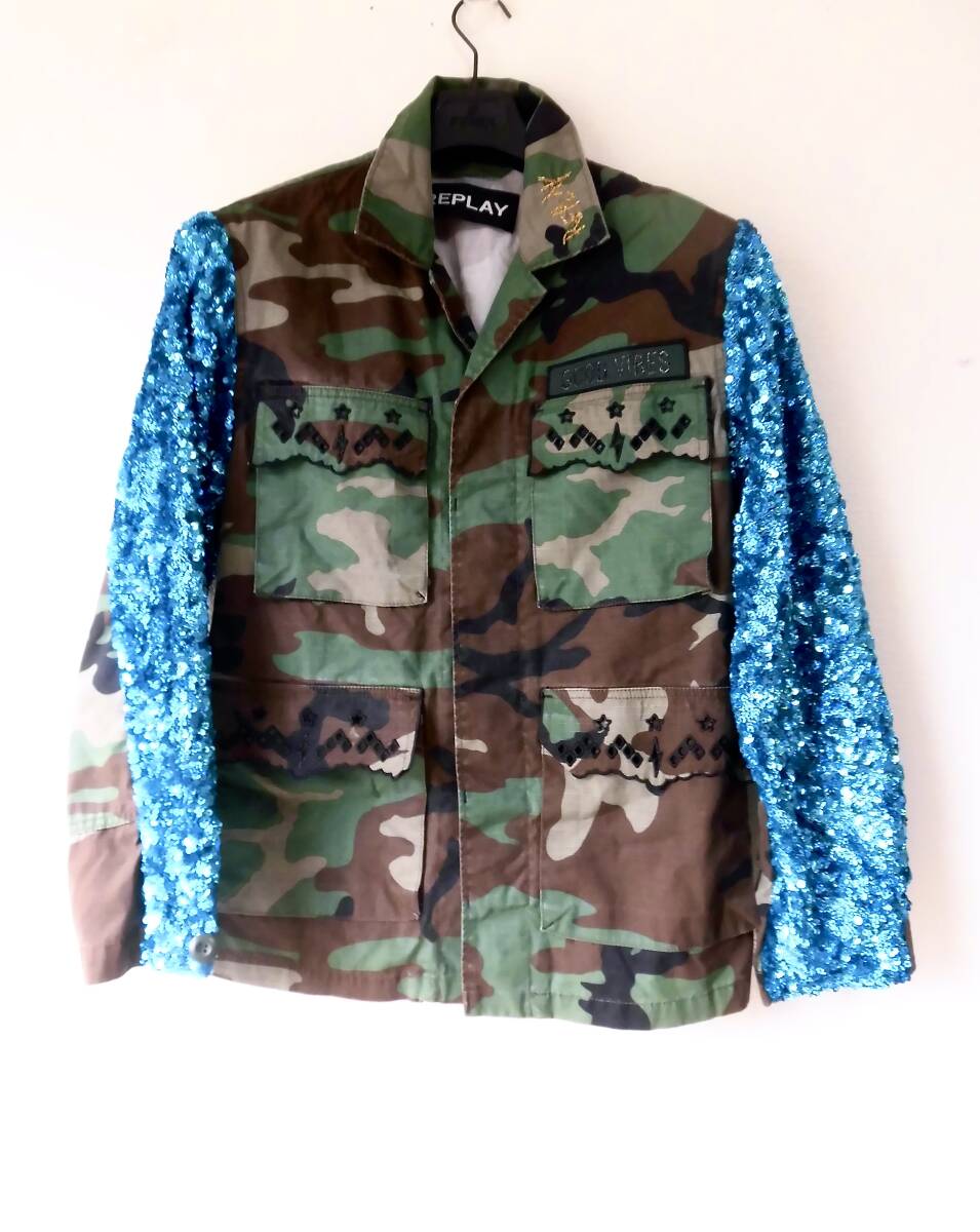 > ●入手困難★ REPLAY リプレイ/世界で1点の加工 アートグリッター ミリタリー ジャケット 迷彩 カモフラージュ /大きいサイズ~LX相当