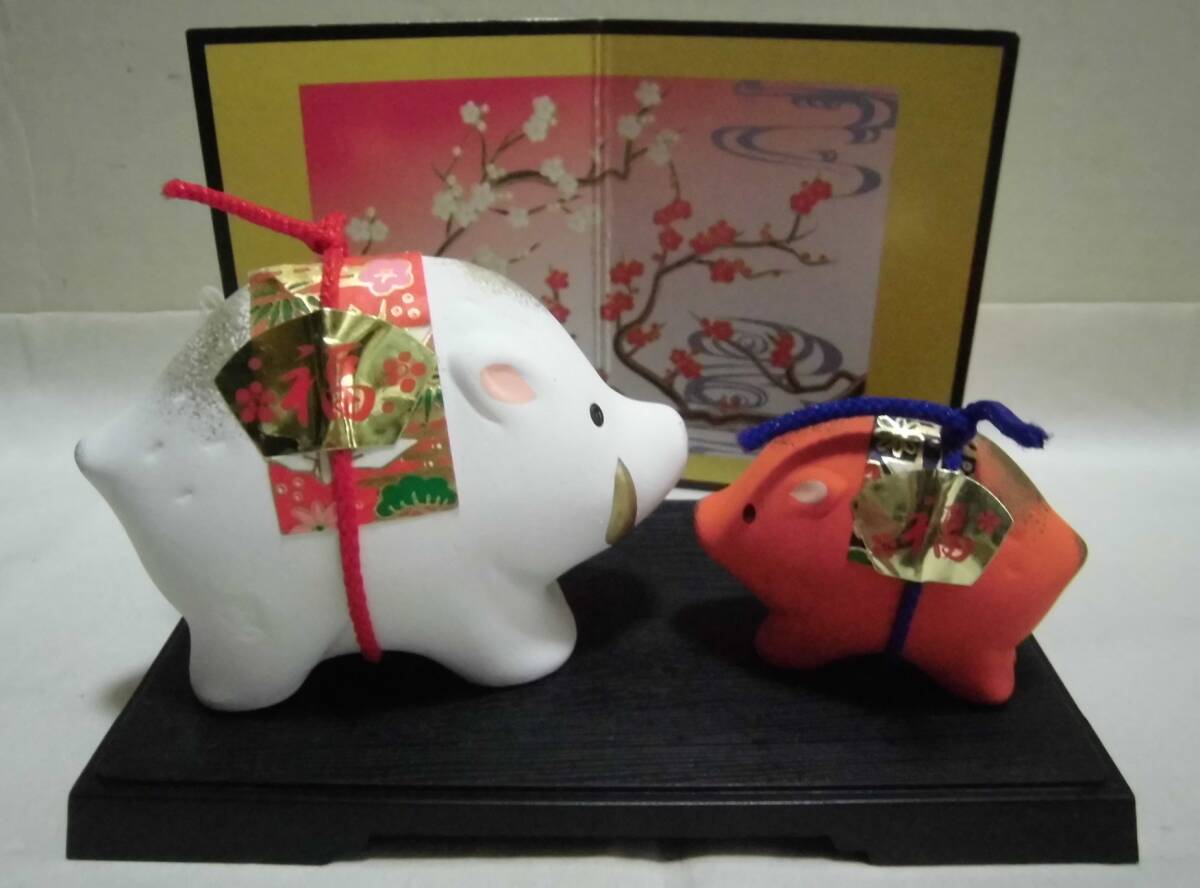 > 干支置物 亥 親子 計2体 飾り台 風付 昭峰作 紅白 金彩 猪 いのしし 陶人形 土人形 招福 開運 縁起物 飾り物 オブジェ 工芸品 レトロ