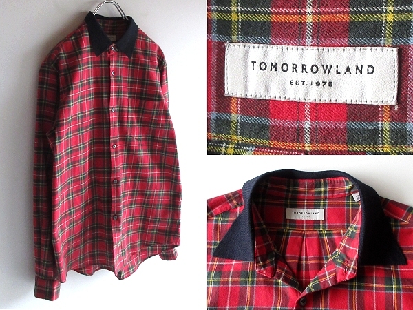 > ネコポス対応 TOMORROWLAND トゥモローランド ニットリブ襟切替 コットン ライトフランネル タータンチェック柄 シャツ S レッド グリーン