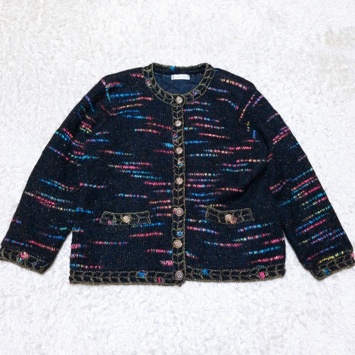 - Y1670 美品★HAND KNIT 金ボタン ゴールドラメ ローゲージ ニットジャケット ノーカラー 長袖 レディース LL相当 ブラック 黒 大きいサイズ
