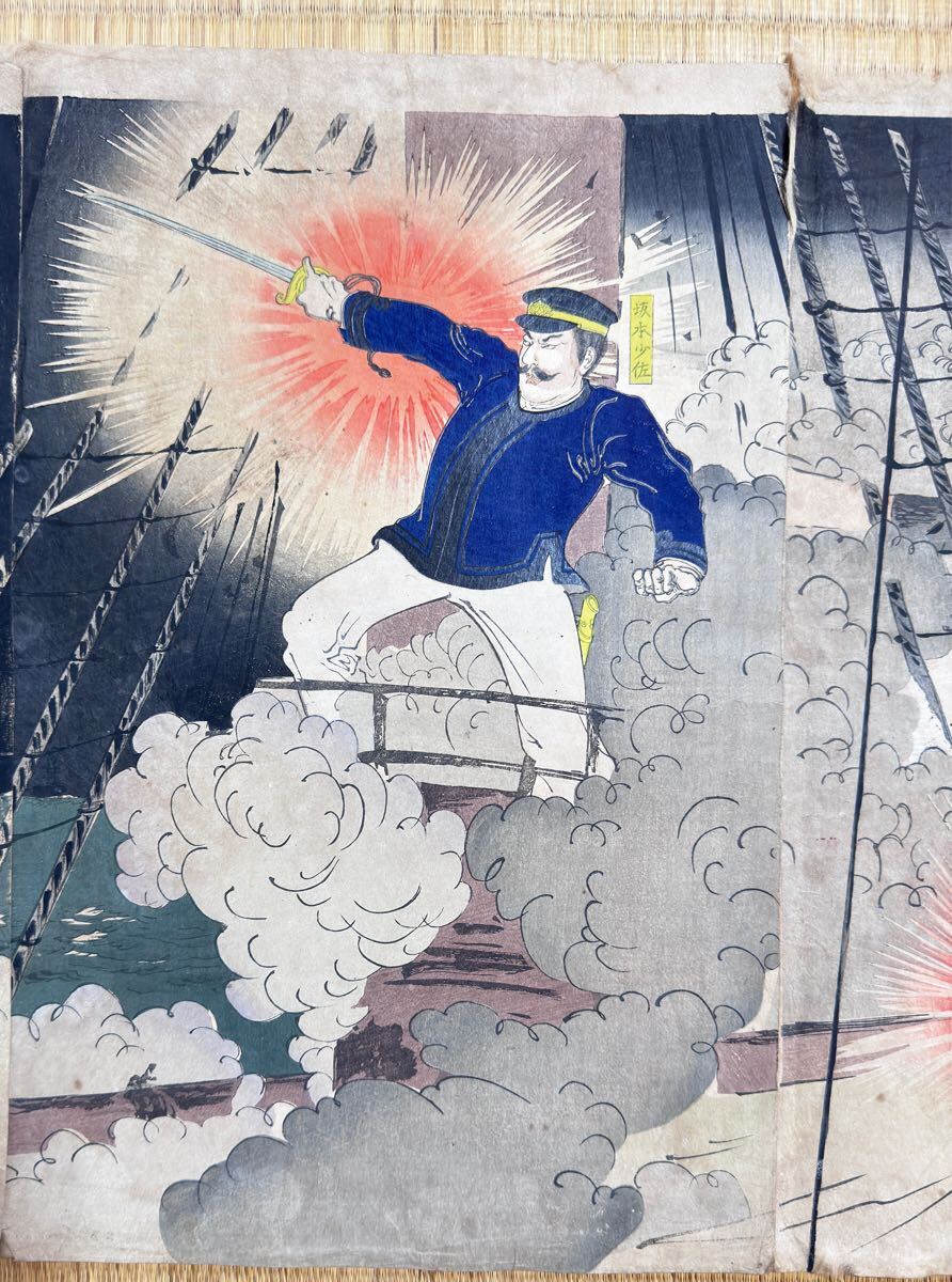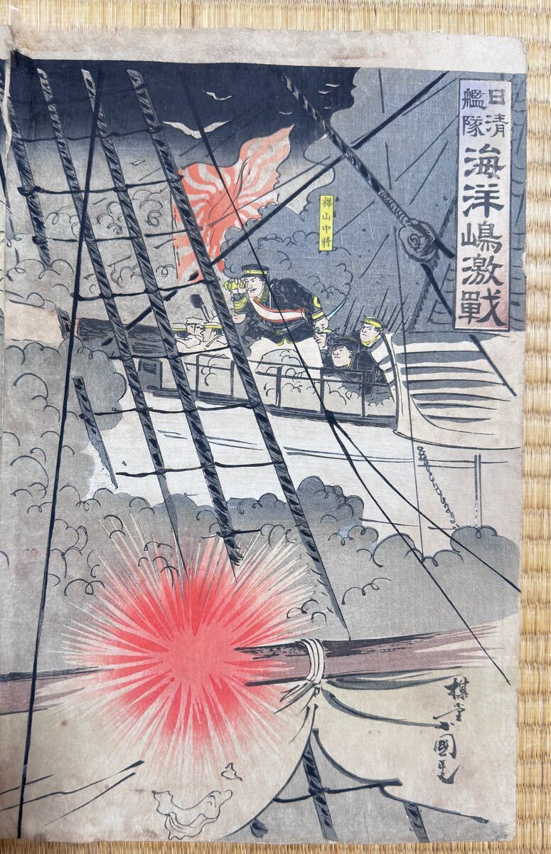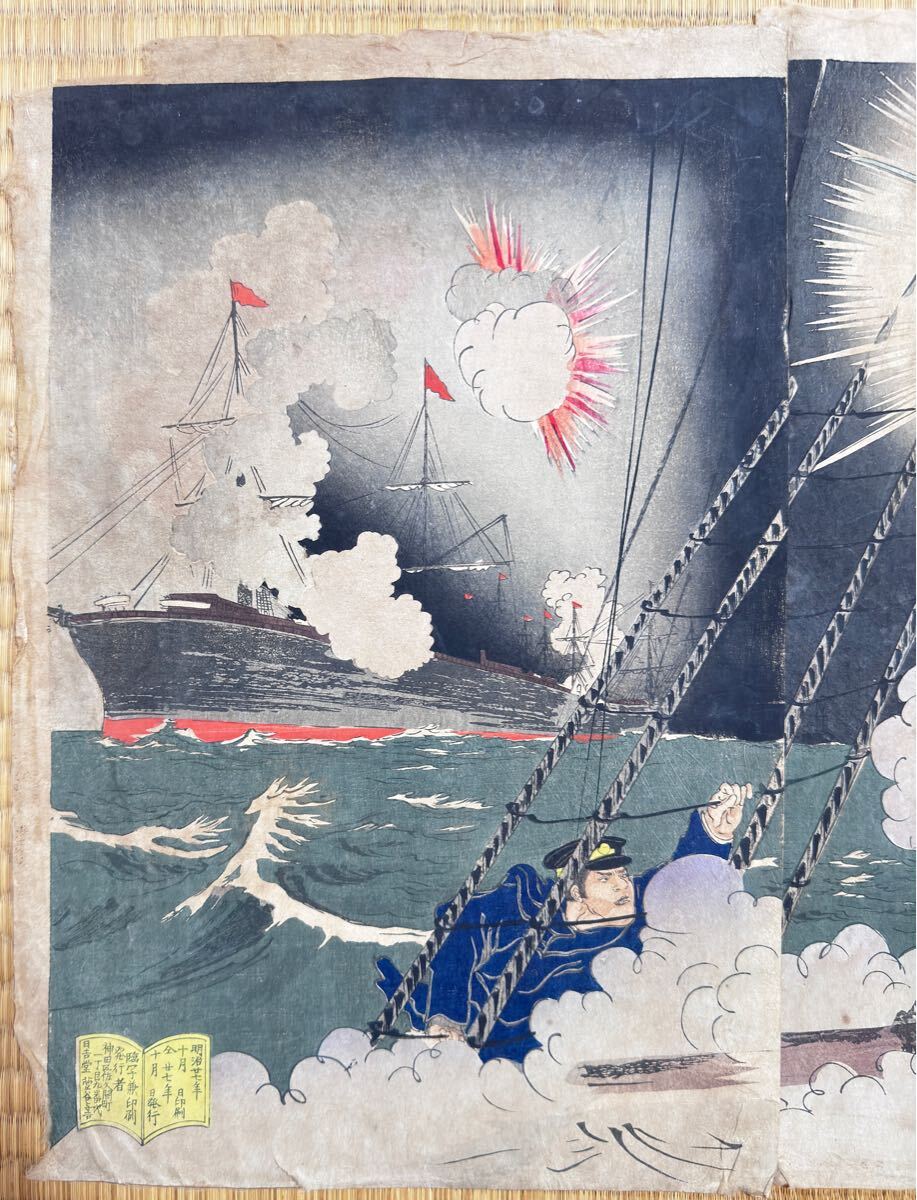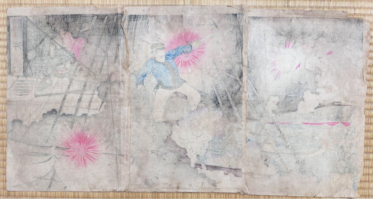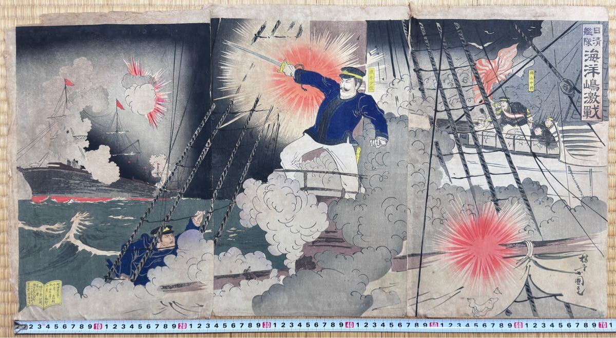 - 大海戦!明治期/真作 歌川国政「日清艦隊 海洋島激戦」本物浮世絵木版画 武者絵 戦争絵 日清戦争 錦絵 大判 三枚続き