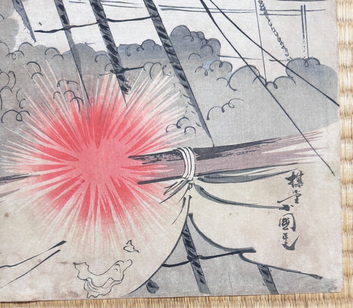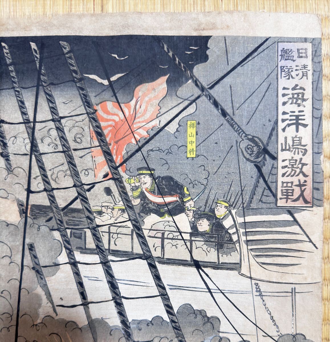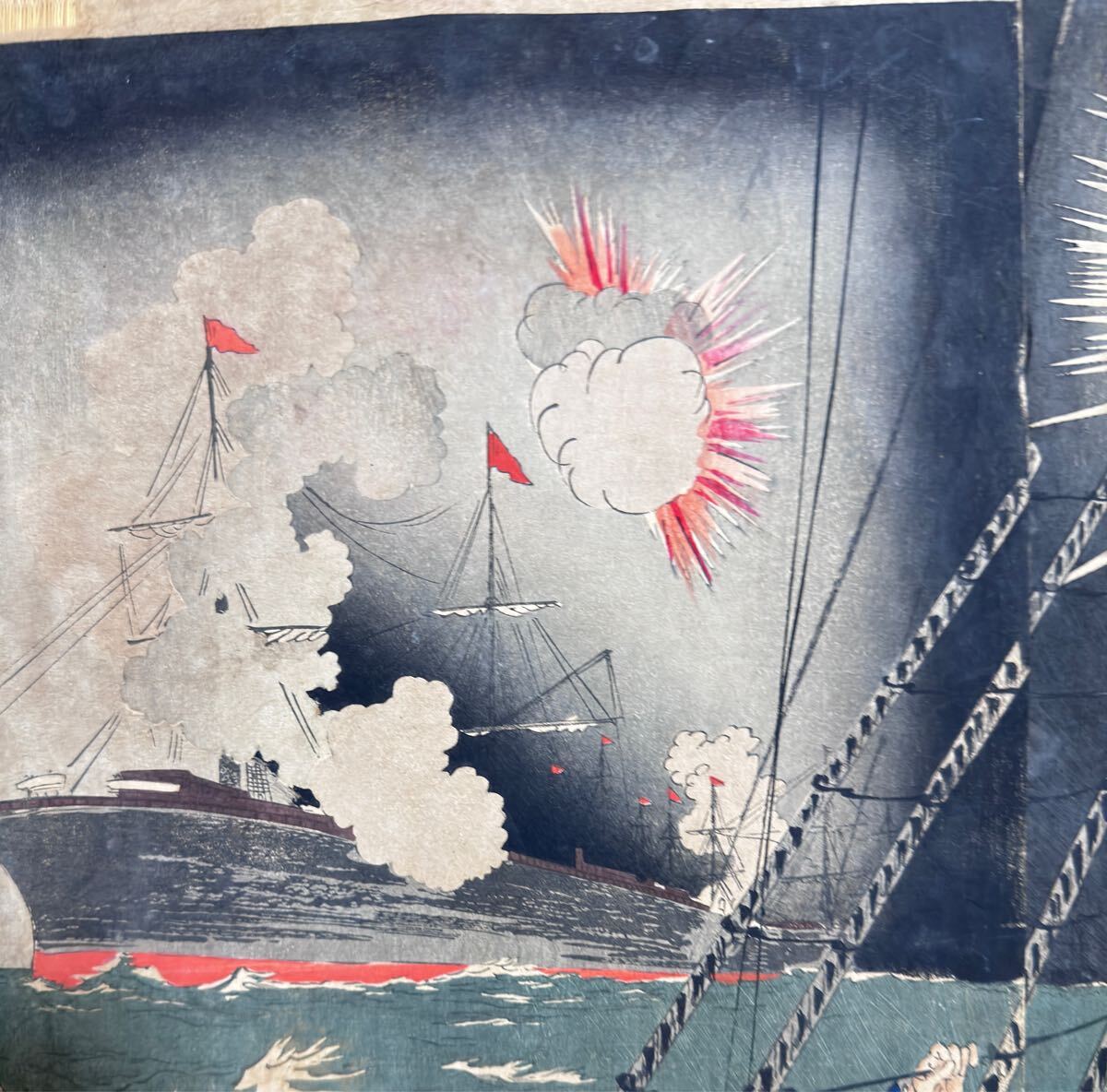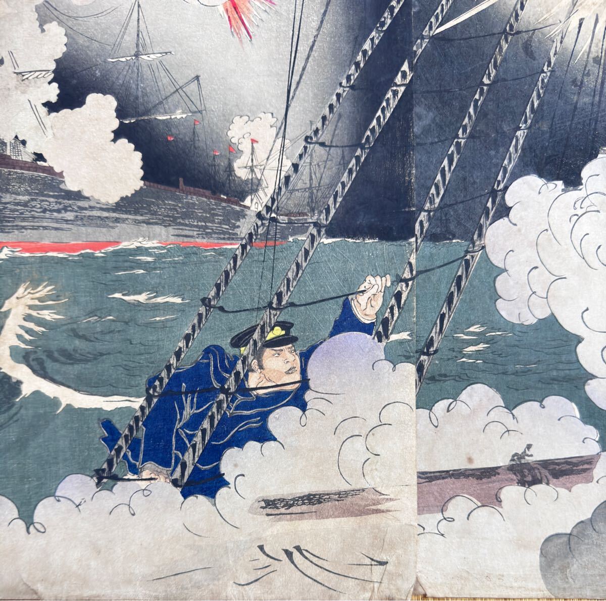 - 大海戦!明治期/真作 歌川国政「日清艦隊 海洋島激戦」本物浮世絵木版画 武者絵 戦争絵 日清戦争 錦絵 大判 三枚続き