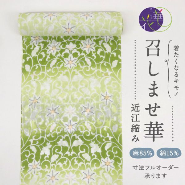 - 【反物】 新品 浴衣 ブランド 『召しませ華』 綿麻 『近江ちぢみ』 花唐草 ピスタチオ緑 夏着物 お仕立て可 反24-21