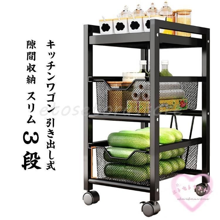 - キッチンワゴン 引き出し式 隙間収納 スリム 3段 キャスター付き おしゃれ キッチンラック バスケット スチール ワゴン キッチン収納
