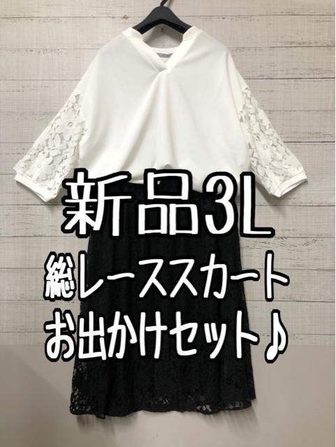 - 新品☆3L♪白系7分袖トップス&黒系総レーススカート♪きれいめ☆k613