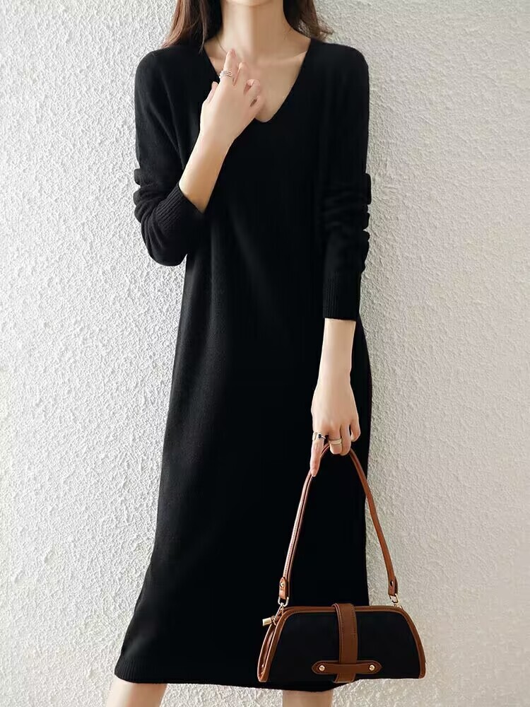- 秋冬美品*オシャレ Vネック ワンピース 秋冬 ニットワンピース 膝丈 長袖 気質良い きれいめ 大人 着痩せ ニットワンピース* 黒