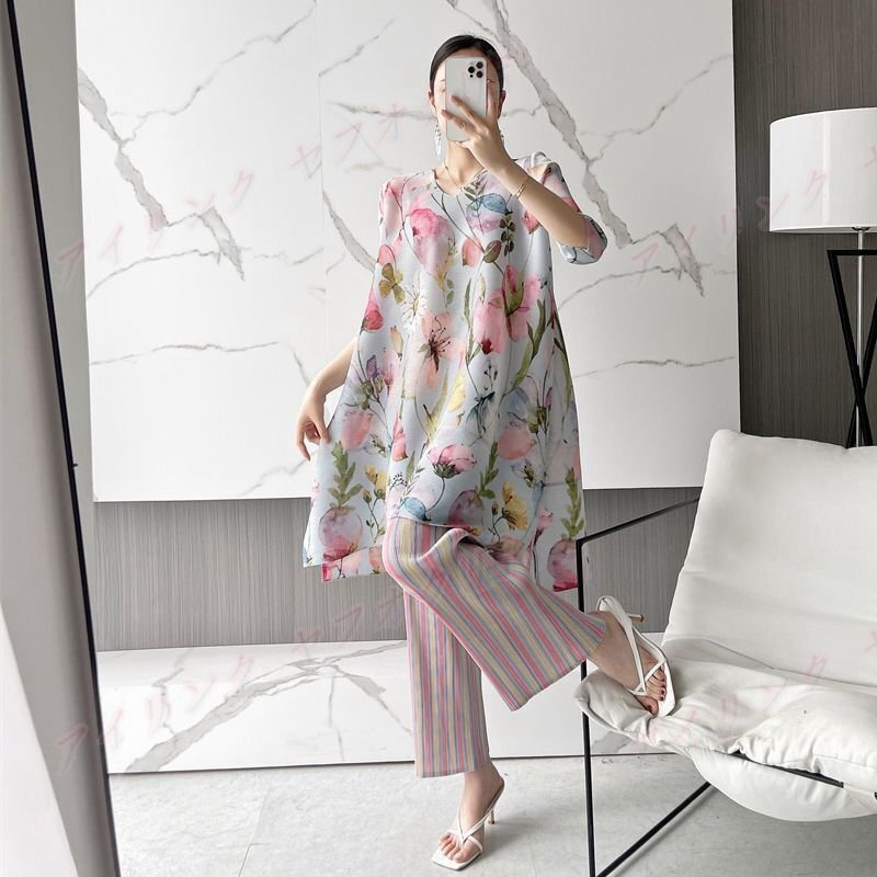 - ☆新品レディーストップス プリーツロングシャツワイパンツ2点セット 肌触り弾力通気性ドレープ性いい 高品質上品優雅花柄