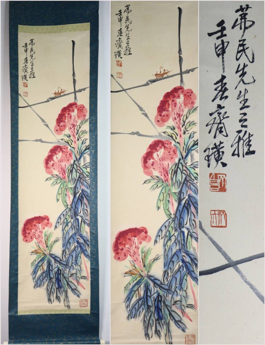 - 古美術 掛け軸 中国・近現代 「斉白石書」 紙本 【花卉草虫図】 立軸 書道 巻き物 肉筆保証 唐物 古画 画心36X137cm LT-2410221