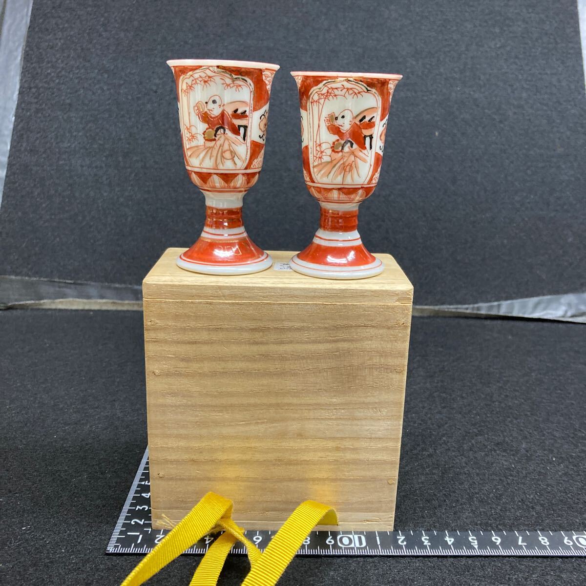 - 九谷焼 赤絵唐子紋 馬上杯 一対合わせ木箱付き アンテーク