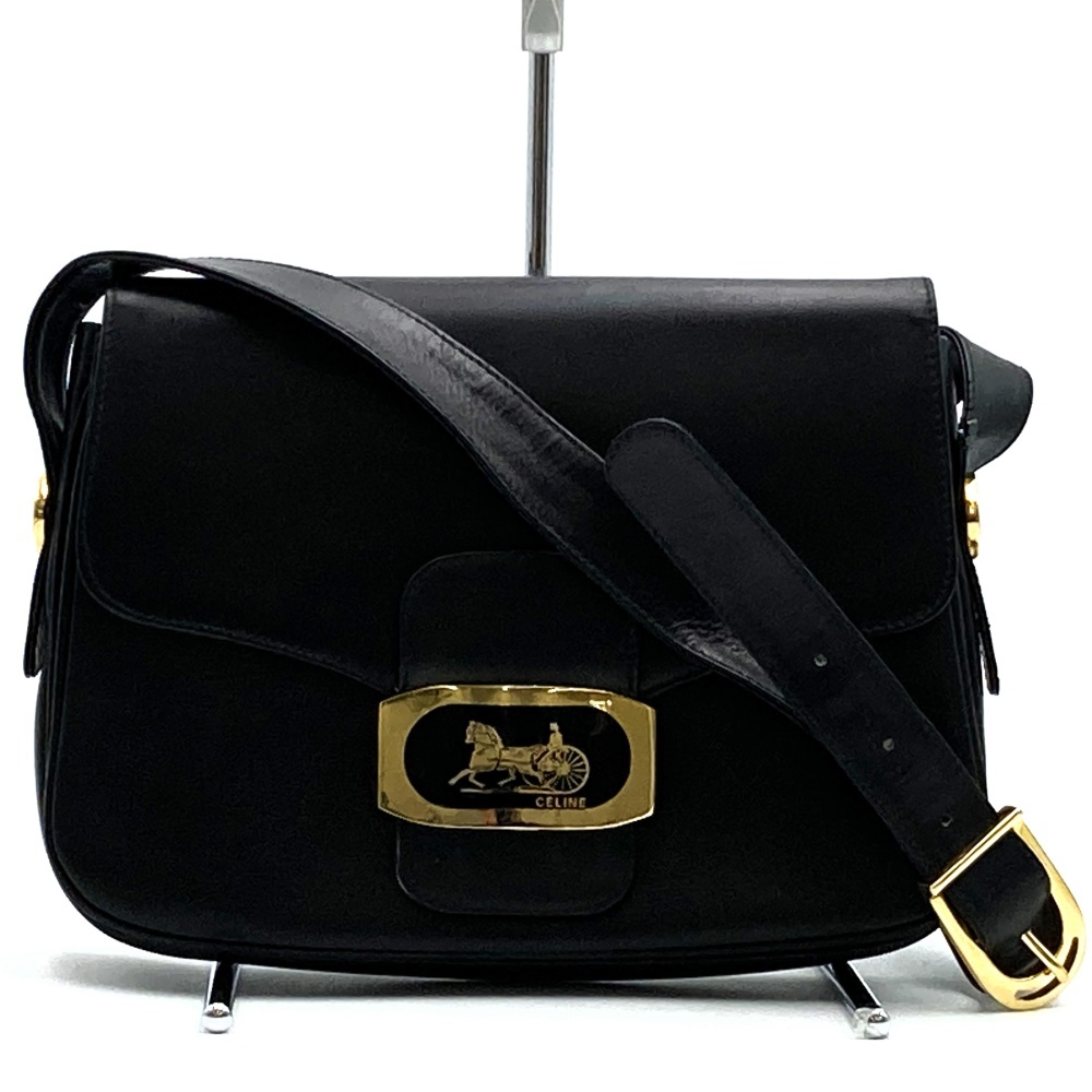 > CELINE セリーヌ ショルダーバッグ 斜め掛け 肩掛けバッグ ブラック レザー 馬車金具 ヴィンテージ ファッション レディース USED