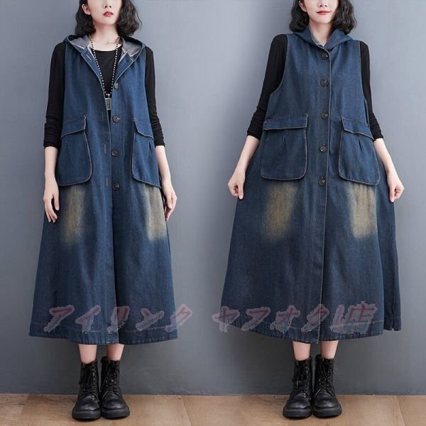 - ☆新品サイズ選択可 カジュアルゆったり デニムベスト フード付き 大きいサイズ 袖なし ロング丈レディース 前開 アウター